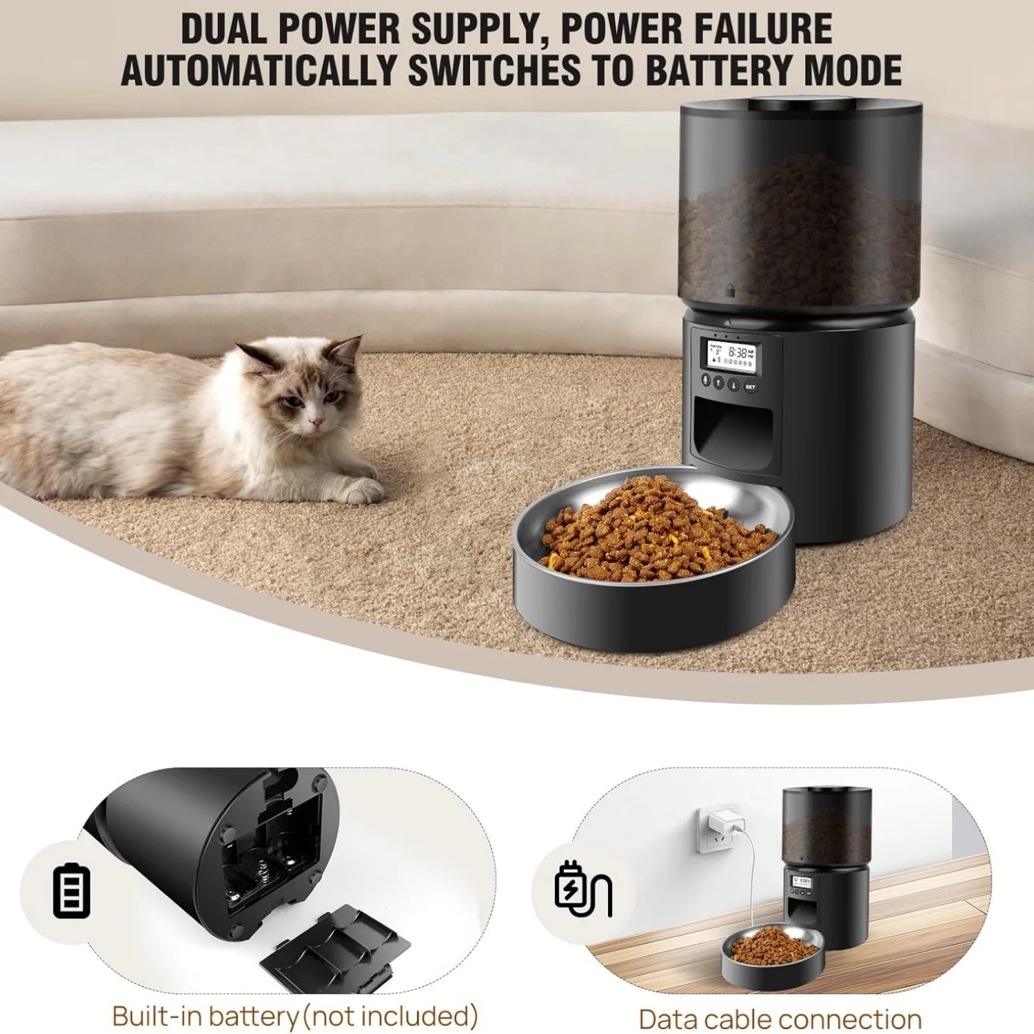 【Double Secure Lock and Dual Power Supply】The food container and lid have safety latches to prevent naughty and greedy pets from stealing food. The cat feeder can be operated by power adapter (included) and 4*AA batteries (not included) to prevent accidental unplugging or power outages, and can also be used in areas without electricity.